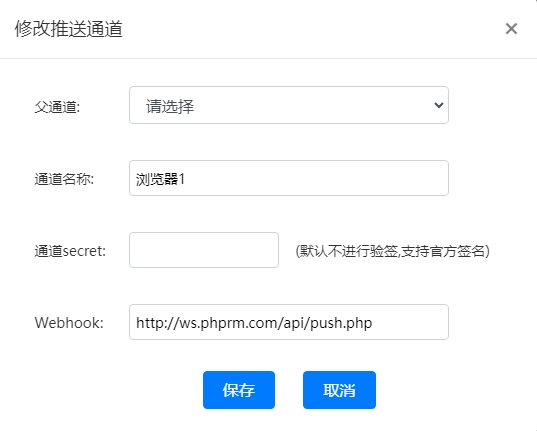 默认创建"浏览器“类型提醒或者通道, 群组成员、消息数据将托管在ws.phprm.com域下, 通过修改通道填写自定义webhook网址可实现数据本地化存储: